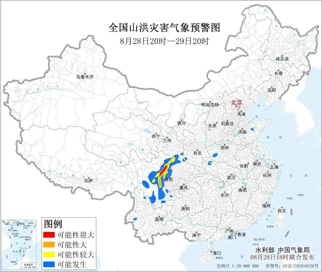 预计,8月28日20时至8月29日20时,四川中部和中北部等地部分地区发生山洪灾害可能性大(橙色预警),局地发生山洪灾害可能性很大(红色预警),预警区域涉及的县(市、区)见下表。其他地区也可能因局地短历时强降水引发山洪灾害,请各地注意做好实时监测、防汛预警和转移避险等防范工作。