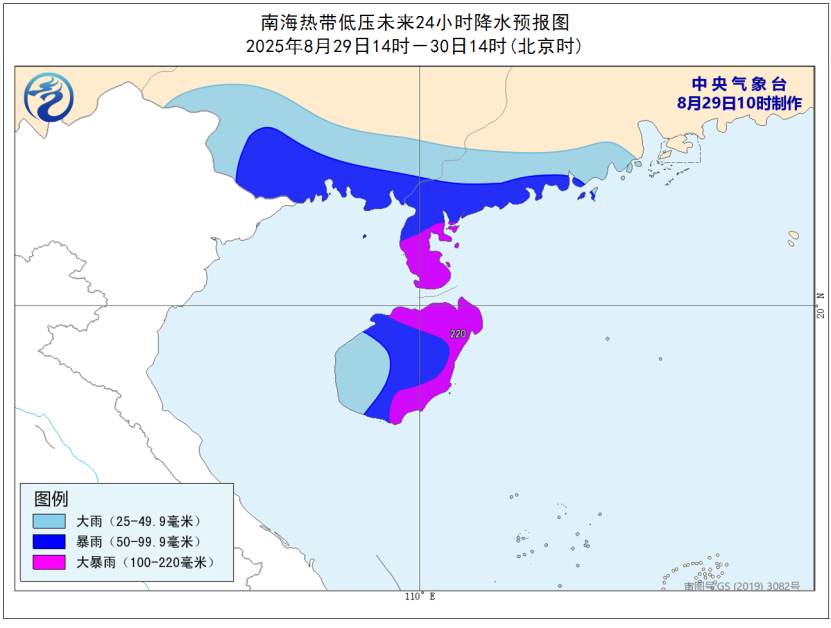 29日14时至30日14时,广东西南部、广西南部、海南岛等地部分地区有大到暴雨,其中,广东西南部沿海、海南岛北部和东部等地部分地区有大暴雨(100-220毫米)。