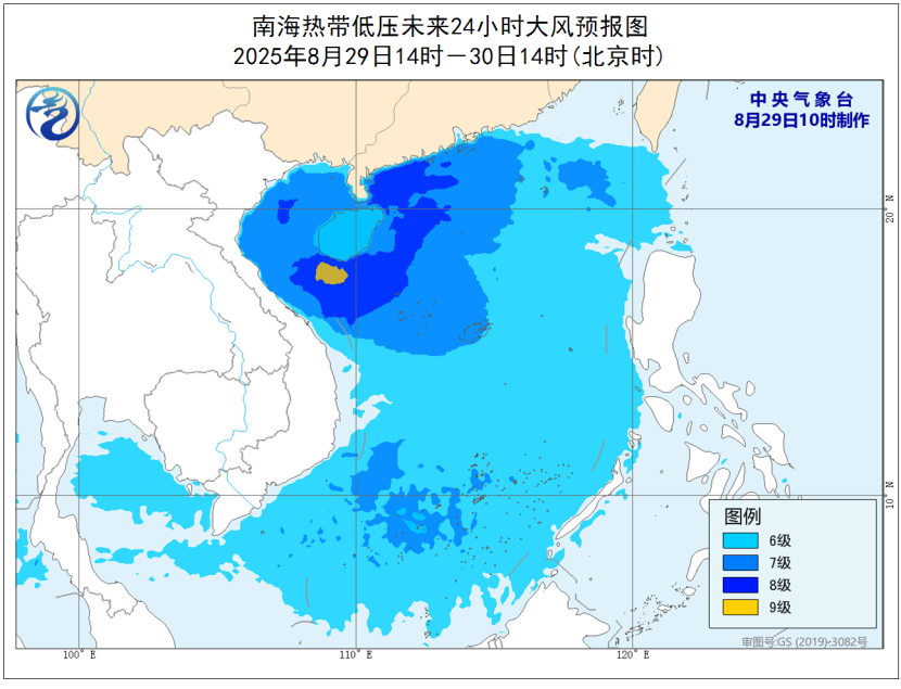 29日14时至30日14时,南海大部、中沙群岛、西沙群岛、南沙群岛和黄岩岛附近海域、北部湾、琼州海峡、广东沿海、广西沿海、海南岛沿海有6-7级大风,其中海南岛南部和东部近海、广东中西部近海风力有8级,阵风9-10级,部分海域风力达9级,阵风10-11级。