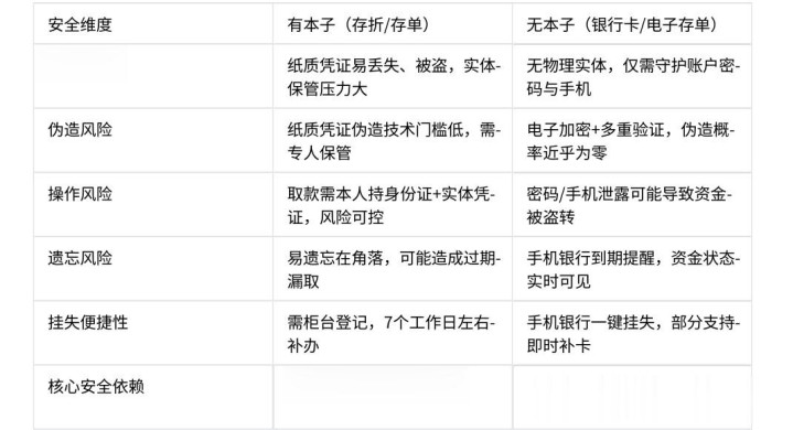 “有本子更安全”是很多人的固有认知,但实际情况要分人群。对于中老年人来说,存折/存单需要本人持身份证+实体凭证才能取款,即使丢失,他人也无法冒领,安全性确实更高;但对于年轻人,习惯线上操作,只要保护好手机密码、不点击陌生链接,电子存单的安全性反而更有保障——毕竟电子凭证不会丢失、被盗,银行的加密技术也能有效防范伪造。