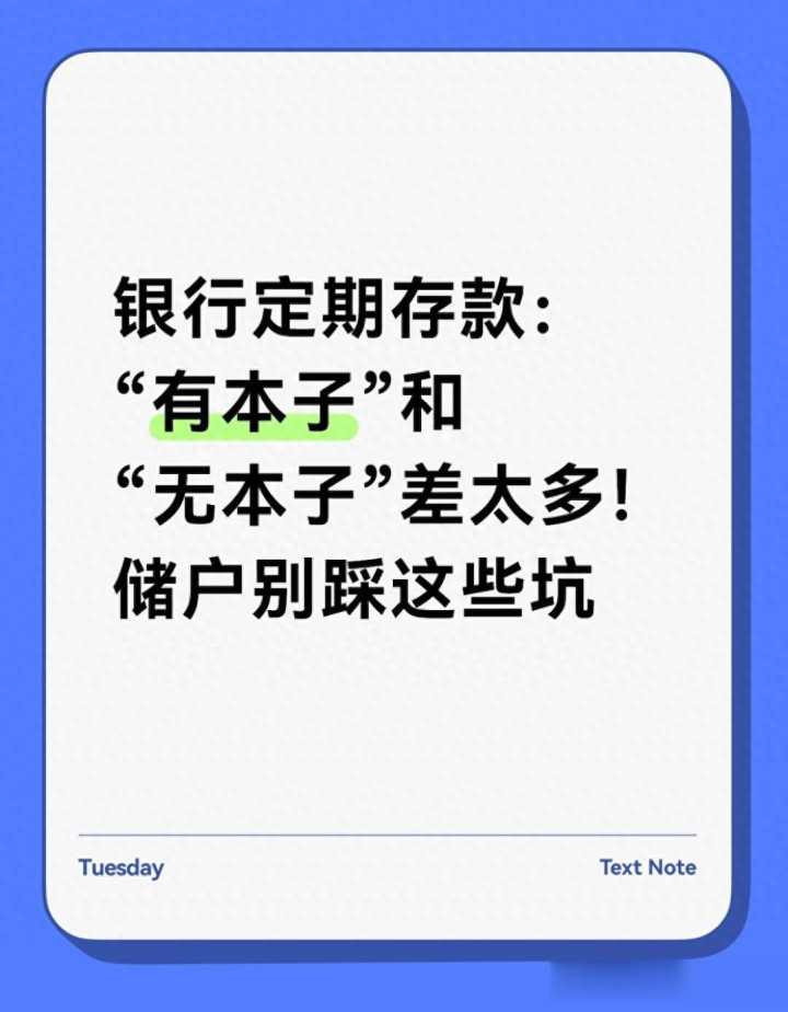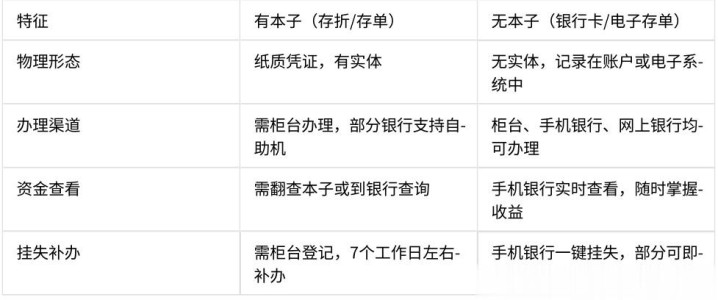 去银行存定期,柜员一句“要存折还是存单,或者直接存卡上?”是不是让你瞬间纠结?同样是定期存款,“有本子”(存折/存单)和“无本子”(银行卡/电子存单)竟然藏着不少关键差异。很多储户凭习惯选择,却不知道选错可能影响利息、安全性甚至取款便利性。今天就用通俗的语言拆解核心区别,帮你根据自身情况精准选择。